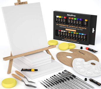 Canvas, acrylic paints, brushes, palettes, aprons, water cups. Printed or mobile inspiration to guide the painting